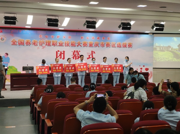 在闭幕式暨表彰大会上,参加本次大赛的各裁判组长对赛事进行了点评,专家组成员王燕作了发言。市民政局副局长徐松强宣读了表彰文件,与会领导现场为获奖单位和个人颁发了奖牌和奖金。最后,市民政局二级巡视员潘鸿滨作了总结讲话,对重庆市养老服务工作者提出了殷切的期望,对养老服务人才队伍建设提出了新的思路,提出了要求。