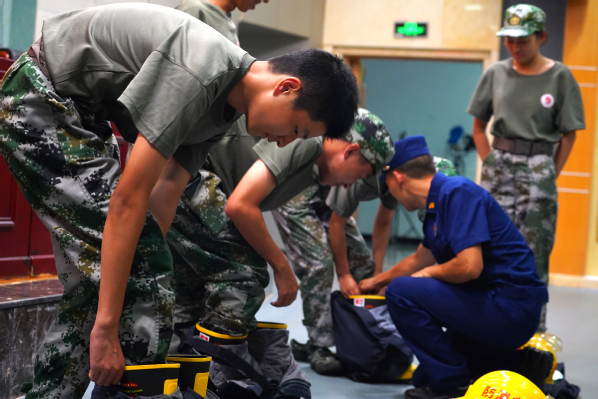 在操作演示阶段,韩站长组织消防员给大家现场演示了如何识别常用灭火器材,如何连接消防水枪,如何使用灭火器,还请参训同学试穿灭火时使用的战斗服。参与穿戴体验的同学通过身体力行,感受到了装备的重量和消防员们身上沉沉的责任。消防员们还利用消防车和配套装备,通过接管、出水,为全体军训师生现场展示了消防救援队伍如何灭火。