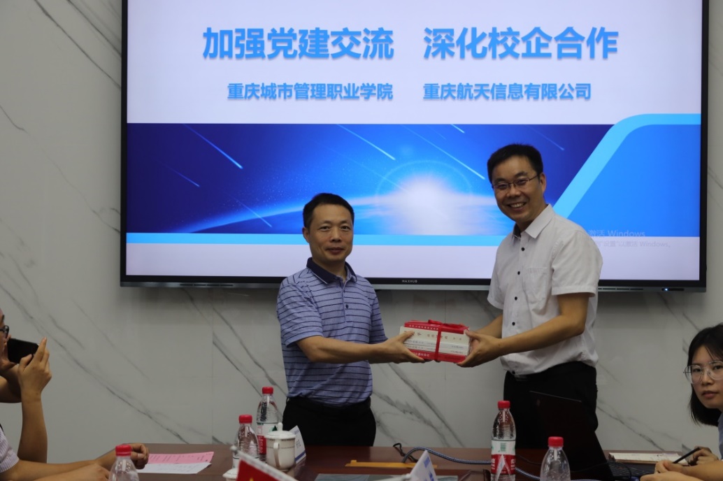 在随后举行的座谈会上,双方围绕基层党建、校企合作、产教融合等进行了深入交流。大家表示,将建立良好的沟通交流机制,加强在业务工作与党建工作有效融合上作深入的实践探索。杨寿康书记还代表学校向重庆航天信息有限公司党支部书记、总经理李北川赠送了党史学习书籍。
