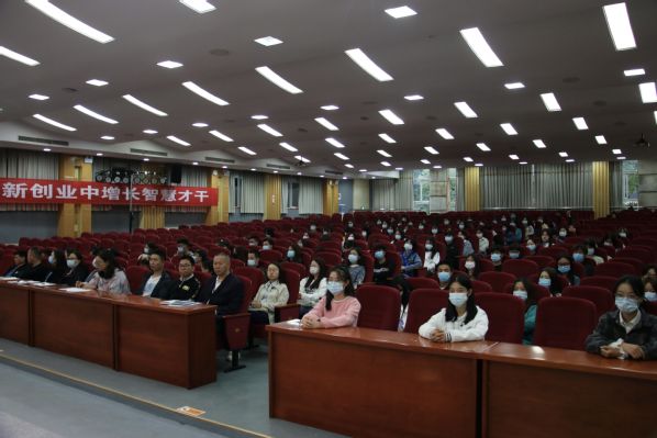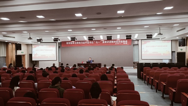 为深入学习贯彻习近平总书记“七一”重要讲话精神,推动党史学习教育深入开展,10月11日,商学院在学术报告厅举行了学习贯彻习近平总书记“七一”重要讲话精神宣讲报告会。宣讲报告由学校党委委员、副校长袁国主讲,商学院党总支书记蒋芹忠主持,学院科级以上干部、党总支委员、各专业党支部委员、师生代表120余人聆听了报告。