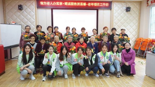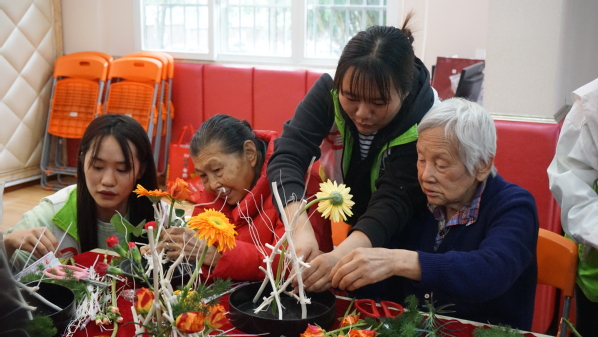 由民政与社会治理学院党总支民政专业党支部承办的老年花艺课程,也非常受老人们欢迎。在支部师生党员、入党积极分子的指导和协助下,老人们兴致勃勃地完成了架构作品的制作。高洁的白桦树枝、火辣热情的火焰玫瑰、象征毅力的非洲菊,以及寓意健康长寿的蓬莱松,通过老人们心灵手巧的组合与搭配,形成了造型别致的花艺作品。在这个过程中,老人们陶冶了情操,充满了幸福感与获得感。