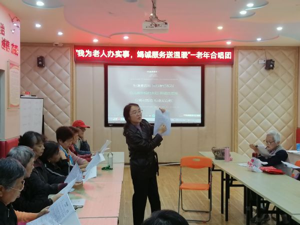 “1、2、3起,老师们注意嘴角上扬,口腔打开,用气息发声……”,工会办公室主任、党员朱俊丽老师正在“唱响岁月”老年合唱团上教授老年人如何正确运用气息科学的发声,老人们聚精会神的听着,在朱老师引导下跃跃欲试慢慢张开口腔发声,老人们发现唱歌原来也是要讲技巧的。随后朱老师教授新的歌曲《相逢是首歌》,讲解演唱这首歌的曲谱和新唱法,为老年人带来了丰盛的声乐“大餐”。