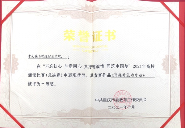 10月22日,由重庆市委教育工委主办的“不忘初心 与党同心 共抒统战情 同筑中国梦” 重庆市2021年高校诵读总决赛在重庆理工大学举行,全市17所高校的200多名师生参加比赛。经过2个多小时角逐,我校民进会员王冠韬老师,民盟盟员张译老师领衔诵读的作品《穿越时空的对话》在本次比赛中荣获一等奖。