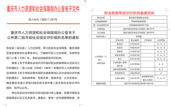 近日,重庆市人力资源和社会保障局发布了《关于公布第二批市级社会培训评价组织名单的通知》(渝人社办〔2021〕221号),我校获批重庆市第二批市级社会培训评价组织,共有美容师、茶艺师、育婴员、养老护理员、电工、工业机器人系统操作员、连锁经营管理师、物流服务师、行政办事员等9个职业获得相应的初、中、高级评价资格。