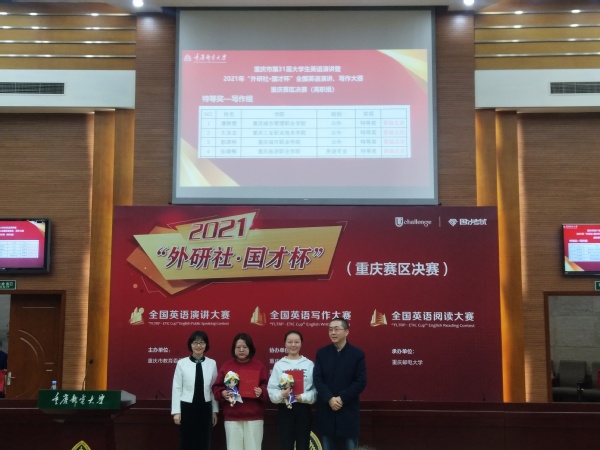 经过初赛,我校选拔出三名学生代表学校参加重庆市比赛。在外语教研室团队教师曹树梦、向士旭、彭昱、杨菲和黄光芬教授的指导下,经过一天的激烈角逐,我校文化与旅游学院潘丽雯获得了重庆市特等奖、文化与旅游学院何晓森获得二等奖,商学院王迪获得三等奖。其中,潘丽雯将代表重庆市赴北京参加全国总决赛。