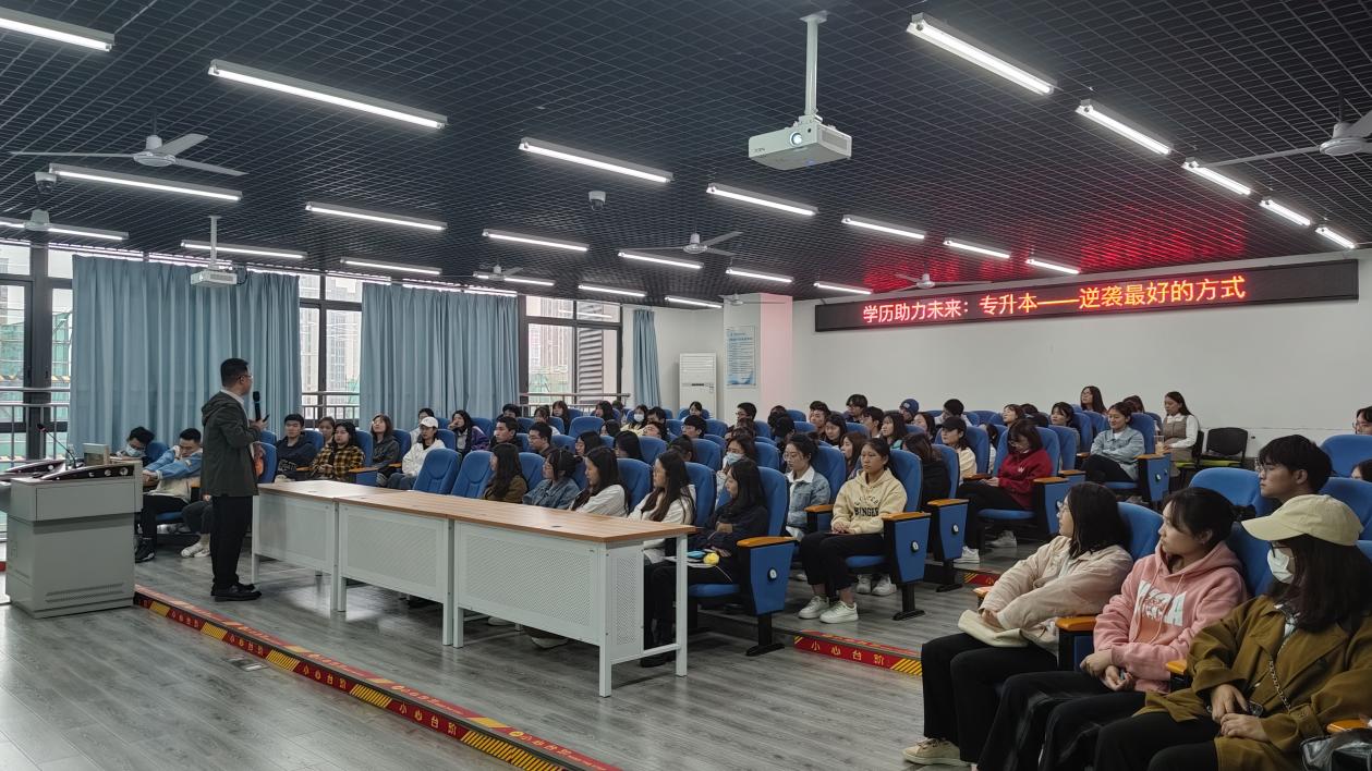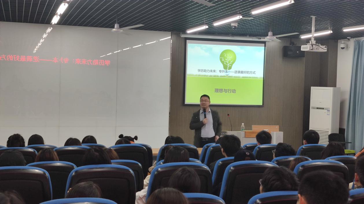 孟继东博士从重庆市普通高校“专升本”工作实施方案、专升本的意义与目的、如何准备专升本、职业生涯与人生规划等方面进行了解读,并结合重庆市选拔高职高专毕业生进入本科学习工作实施细则以及多年的教学经验,全方位讲解专升本的政策与形势,及时有效地解决学生诸多疑问。孟博士的讲解深入浅出,案例生动贴切,使同学们获益匪浅。