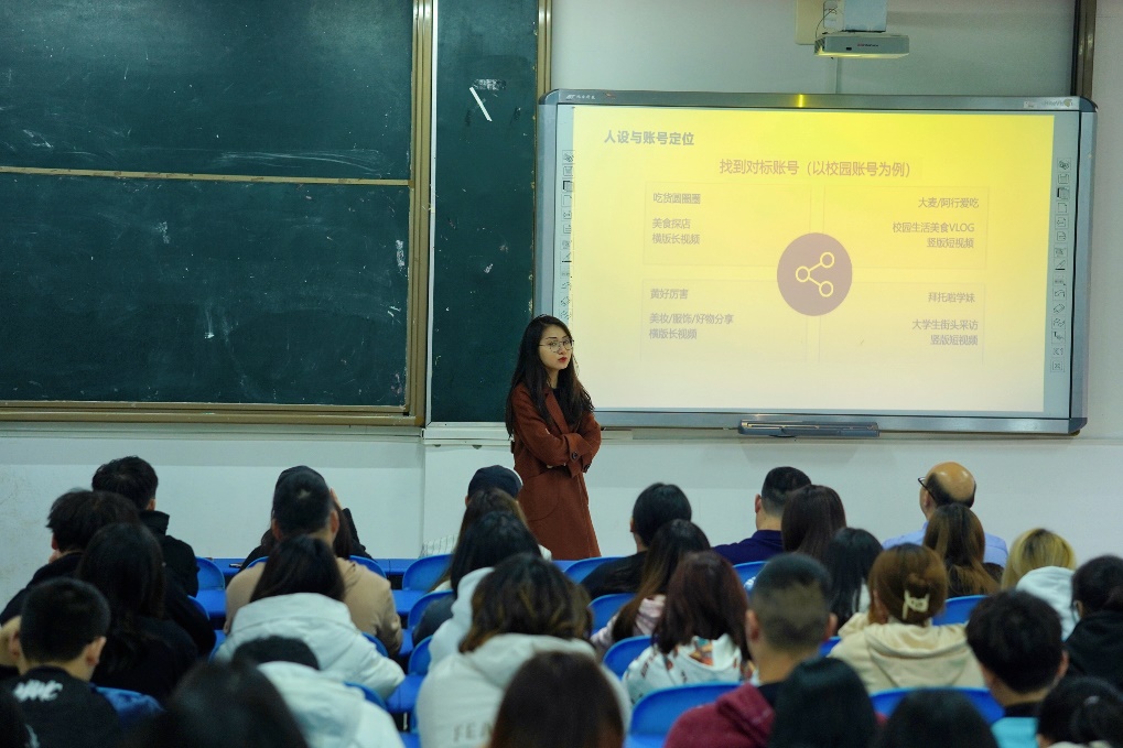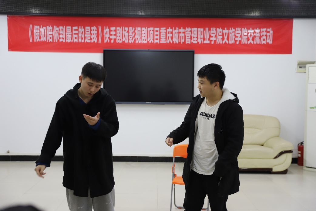 活动中,快手重庆创新发展中心内容创作及直播电商负责人吴秀琼老师,以通俗易懂的方式向同学们介绍了新媒体传播行业的发展前沿趋势,并以“校园短视频创作”为主题,围绕账号运营规划、视频内容产出、视频发布、数据分析、直播及高质量转化等方面做了精彩的讲解。活动还邀请了快手剧场的剧组人员到场,由重庆市委宣传部、重庆市电影局支持,快手投资的院线影片《假如陪你到最后的是我》总导演牟天翔就影视作品拍摄、镜头语言表达、表演技巧等方面内容给同学们做了详细阐述与示范。最后的“我是实力演技派”互动学习环节,更是吸引了学生们的积极参与,现场气氛热烈、过程轻松愉快。