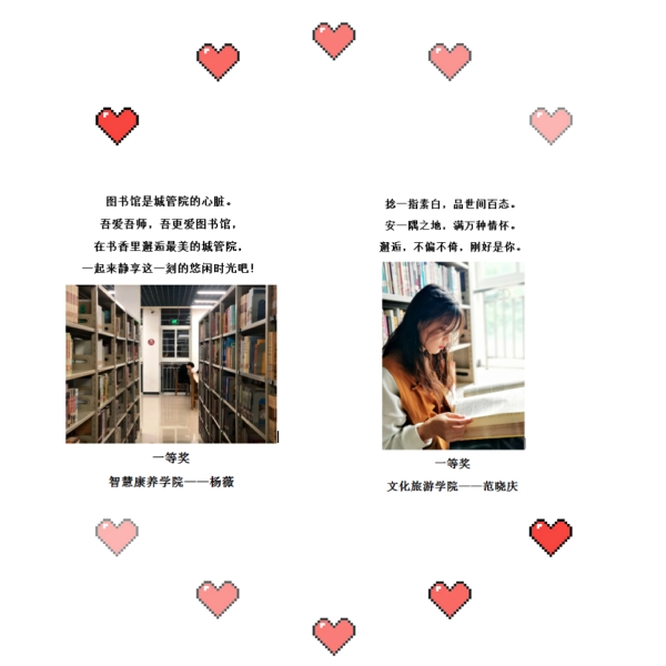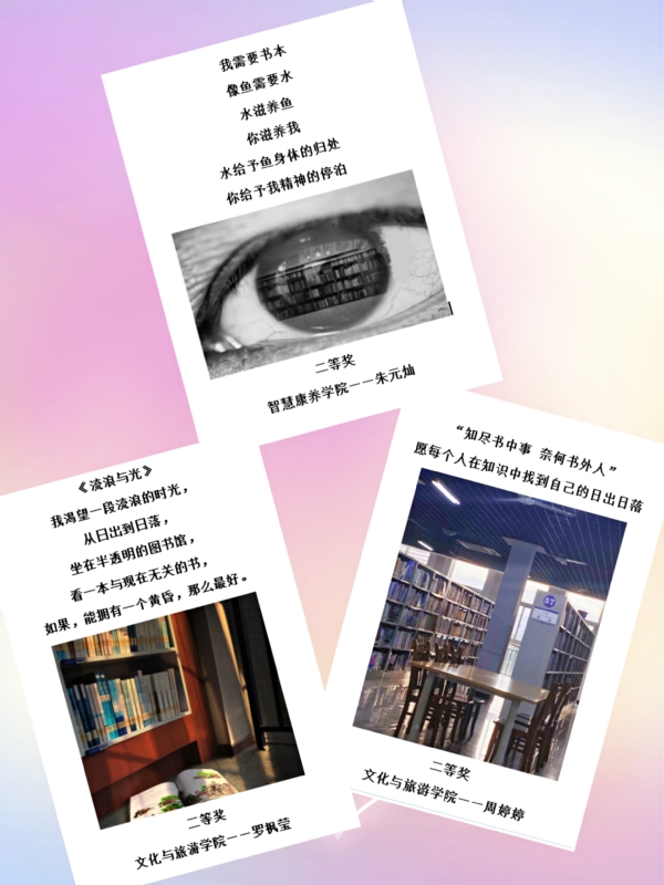 此次活动得到了全校师生的广泛响应和积极参与,收到了以学校图书馆为主题大量的优秀摄影作品。同学们用镜头展现了一个丰富多彩的图书馆美景,充分体现了读者对阅读的喜爱之情,展现了读者对图书馆的热切关注。经过层层筛选和专家公正、公平的评审,21位同学的作品脱颖而出:文化与旅游学院秦开荣获特等奖;文化与旅游学院范晓庆、智慧康养学院杨薇获一等奖;文化与旅游学院罗枫莹、文化与旅游学院周婷婷、智慧康养学院朱元灿获二等奖;商学院黄紫洁、文化与旅游学院熊仪密、智慧康养学院刘彦宏等6位同学获三等奖;文化与旅游学院杨润婵、商学院丁婧、数智财经学院杜薇等9位同学获优秀奖。