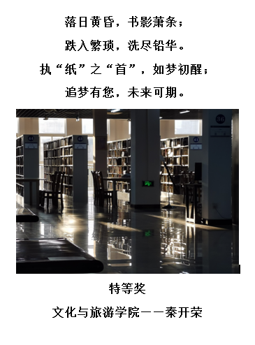 本次活动不但活跃了校园文化生活,促进了图书馆与学生之间的互动和交流。同时,为同学们搭建了一座展示其摄影技术以及创新、创意、审美和观察能力的平台,提高了同学们的艺术修养,展现了他们的青春风采和精神面貌。