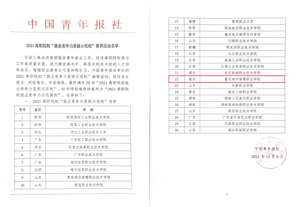 11月9日,中国青年报社公布了《2021高职院校“就业竞争力星级示范校”推荐活动名单》,我校获评2020年高职院校“就业竞争力星级示范案例”。
