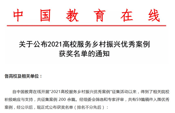 自中国教育在线开展“2021高校服务乡村振兴优秀案例”征集活动以来,得到了相关院校积极响应与支持,共征集案例200余篇。经组委会筛选和专家评审,共有59篇稿件入围优秀案例。
