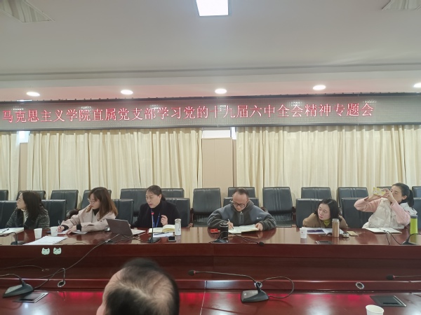 为深入学习党的十九届六中全会精神,全面贯彻习近平新时代中国特色社会主义思想,不断加强思政课教师的思想道德建设与理论素养,马克思主义学院直属党支部于11月23日在学校办公楼二会议室开展了党的十九届六中全会精神专题学习会。会议由马克思主义学院直属党支部书记唐丽主持,学院教职工参加了会议。