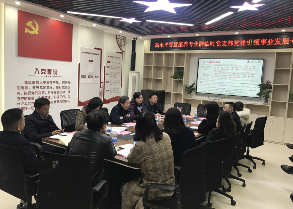 会上,智慧康养学院党总支书记张俊带领大家学习《中共中央国务院关于加强新时代老龄工作的意见》,并从加强老年健康服务体系建设方面,解决失能老年人长期照护服务和保障方面,深入推进医养结合的相关举措方面进行了解读。随后,智慧康养学院院长田奇恒带领大家学习《智慧健康养老产业发展行动计划(2021-2015年)》,田院长结合学院当前的人才培养、科研、社会服务工作实际,重点分析了智慧健康养老产业中可为之处、从何为之等关键问题,希望临时党支部全体党员积极思考,为进一步促进智慧健康养老产业发展贡献自己的力量。