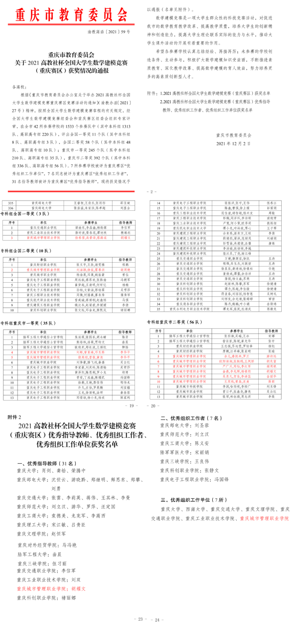 12月2日,2021年“高教社杯”全国大学生数学建模竞赛获奖名单揭晓,我校参赛队伍再创佳绩,共有10支队伍获奖。其中胡耀文老师指导的徐春雷、禹景译、蔡路遥学生队伍荣获全国一等奖;谢周艳老师指导的刘涵颖、徐宸、霍粤洪学生队伍荣获全国二等奖;李华平老师指导的2支队伍获得重庆市一等奖;游诗远、胡先富、谢周艳、胡耀文、谷丽华、薛颖老师分别指导的6支队伍荣获重庆市二等奖。同时学校荣获全国大学生数学建模竞赛重庆赛区优秀组织工作单位奖,胡耀文被评为全国大学生数学建模竞赛重庆赛区优秀指导教师。