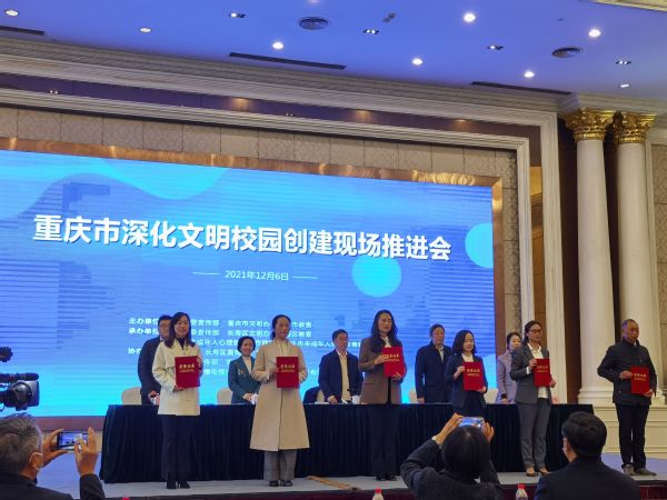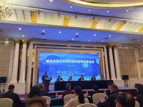 为深入学习贯彻党的十九届六中全会精神、市委五届十一次全会精神,更加扎实开展党史学习教育,12月6日,全市深化文明校园创建现场推进会在长寿区召开。市委宣传部副部长、市文明办主任马岱良,市委教育工委专职副书记覃正杰,全市大中小学文明校园代表190余人参加会议。会议由市委教育工委专职副书记覃正杰主持。我校党委委员、党委宣传网工部部长喻永均应邀参加并作大会交流发言。