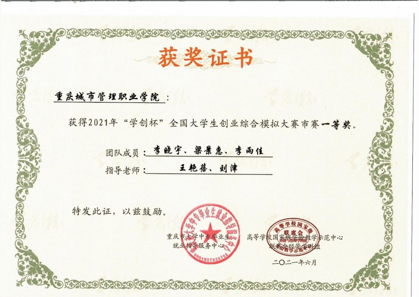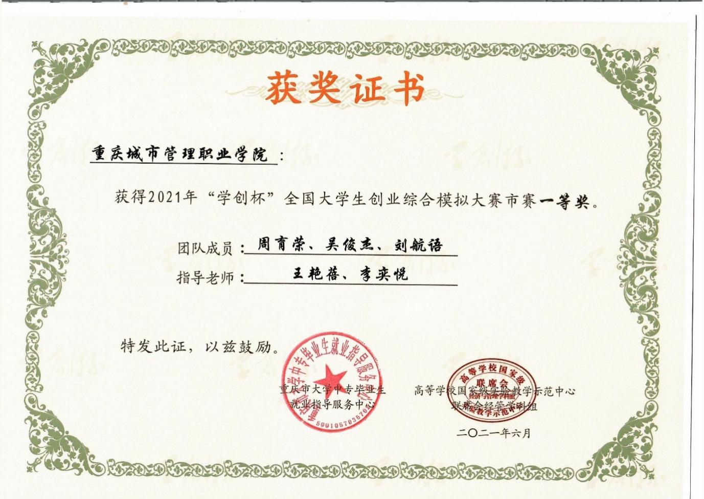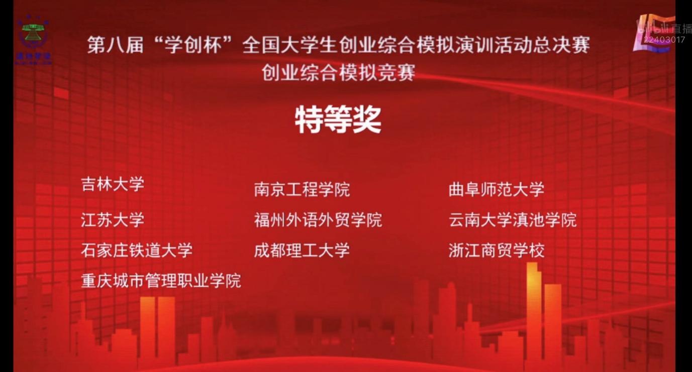 12月11日,由高等学校国家级实验教学示范中心联席会经管学科组主办的第八届“学创杯”全国大学生创业综合模拟演训活动总决赛在云南大学滇池学院举行。全国共有1075所高校,超过3万支队伍,15万名师生参与,经过校赛和省(市)赛层层角逐,共有230所院校晋级全国总决赛,总决赛因疫情防控需要,通过在线方式进行。经过角逐,我校参赛团队以总成绩99.5分的优异成绩荣获创业综合模拟竞赛全国特等奖,成为自2014年该赛事正式开赛以来,重庆市唯一获得过全国总决赛特等奖的高职院校。