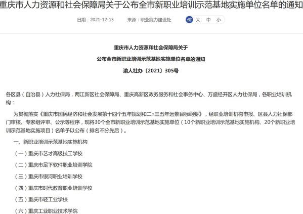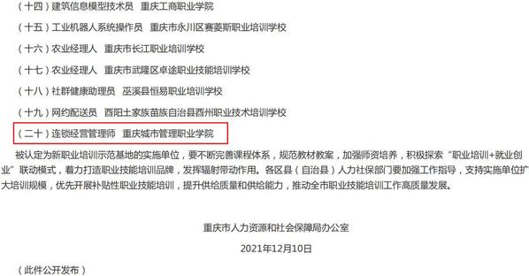 12月10日,重庆市人力资源和社会保障局发布了《关于公布全市新职业培训示范基地实施单位名单的通知》(渝人社办〔2021〕305号),我校获批连锁经营管理师新职业培训示范基地实施项目。