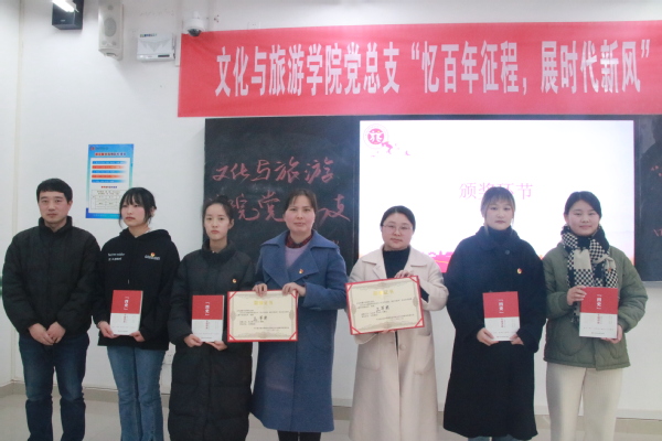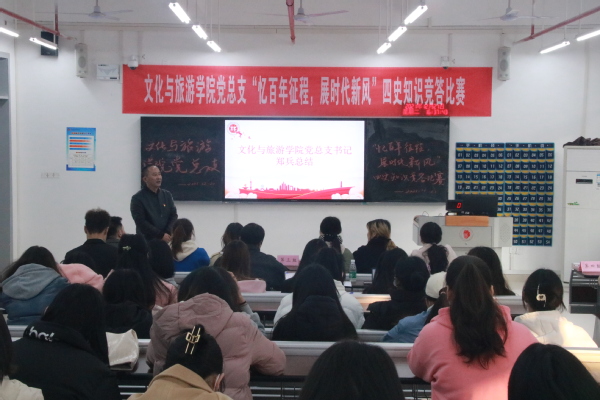 为深入贯彻落实习近平总书记关于深入学习党史、新中国史、改革开放史、社会主义发展史(以下简称“四史”)的重要指示精神,引导党员干部群众把“四史”学习教育与学习习近平新时代中国特色社会主义思想紧密结合,在新时代发扬党的光荣传统、优良作风,推动文化与旅游学院广大党员干部群众知史爱党、知史爱国、不忘初心、勇担使命,文化与旅游学院党总支于12月21日下午在致用楼C106开展“忆百年征程,展时代新风”“四史”知识竞答活动,活动由文化传播专业群党支部承办,文化与旅游学院党总支书记郑兵、专职组织员喻浩、部分党员师生及第22期入党积极分子培训班学员参加了此次活动。
