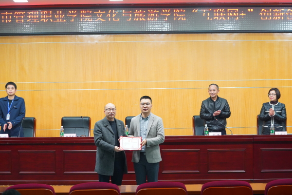 会上,柏文涌院长宣读了《文化与旅游学院“互联网+”创新创业工作实施方案》。创新创业指导教师代表袁晓凤分享了指导首届“互联网+”创新创业大赛备赛心得。“学创杯”全国大学生创业综合模拟大赛重庆市赛一等奖获得者李雨佳同学发表了参加“学创杯”比赛获奖感言。重庆四国创新科技有限公司创始人赵华东作为特邀专家向师生们作了题为《从埋下种子开始,静待长出成长之花》的创新创业培训报告,柏文涌院长向赵华东颁发了文化与旅游学院创新创业导师聘书。