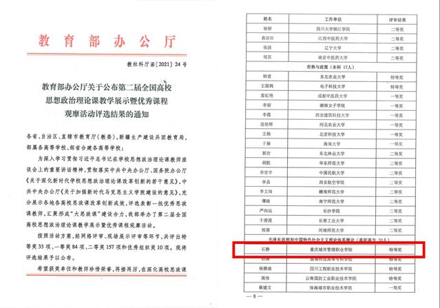 11月26日,教育部对第二届全国高校思想政治理论课教学展示暨优秀课程观摩活动评选结果予以公布。我校马克思主义学院石静副教授荣获全国特等奖,是重庆高职院校唯一获得特等奖的教师。这充分展示了我校思想政治理论课教师教学能力水平,彰显了我校思想政治理论课教学改革创新方面取得的成效。