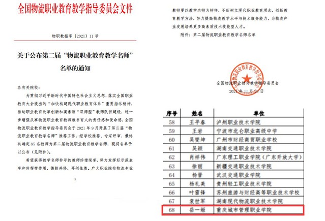 本次获奖再次扩大了我校现代物流管理专业的全国影响力。岳一姬老师作为一名高校教师党员、商学院物流工程学科带头人,全国物流管理职业技能等级证书师资培训核心导师,成功入选物流行业职业教育教学名师,这既是对其个人在物流职业教育教学领域取得突出成绩的认可,也充分印证了我校现代物流管理专业在专业建设、人才培养和师资队伍建设方面的傲人成果。