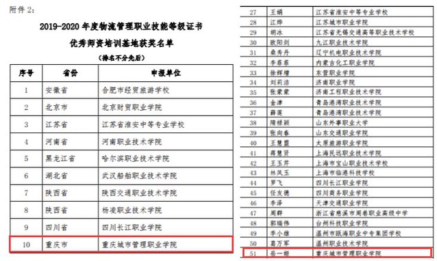 北京中物联物流采购培训中心是中国物流与采购联合会直属的全资机构,负责行业人才标准编制、行业人才培训与认证、物流与供应链管理专业教学指导等具体工作。物流管理职业技能等级证书由北京中物联物流采购培训中心负责考核认证工作,得到了行业、院校以及企业的高度认可。本次评选有314个院校参加,共有638个教师参评先进个人,最终评选出140所先进单位和355名先进个人,其中全国优秀师资培训基地全国仅有10家,重庆仅我校获得该项荣誉。