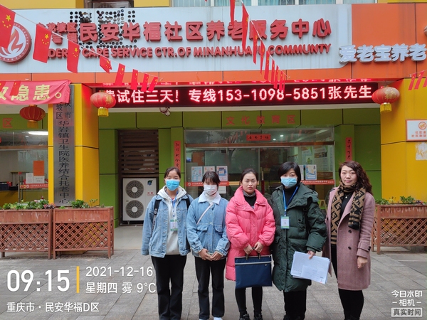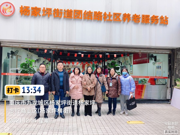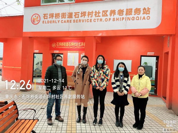 2021年12月13-17日,博士科创团队成员张墨、向钇樾、黄茜3名教师受重庆市九龙坡区民政局及重庆市养老服务协会委托,携学生志愿者走访了重庆市九龙坡区杨家坪、谢家湾、石坪桥、黄桷坪、渝州路、中梁山街道及华岩镇,分别对街道辖区内的80余家社区养老服务中心(站)开展了运营绩效考核与星级评定,并调查了1600余位老人对辖区内中心(站)的满意程度。