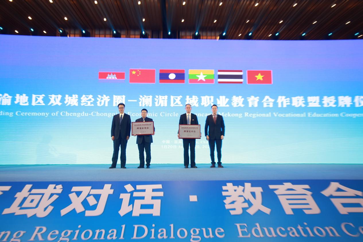 作为论坛活动的重要内容,我校与宜宾职业技术学院联合筹建的“成渝地区双城经济圈-澜湄区域职业教育合作联盟”正式成立。在联盟成立仪式上,首先由来自重庆市教委、重庆市外办、四川省外办、四川省教育厅以及宜宾市政府的嘉宾与我校校长邓明国、宜宾职业技术学院校长伍小兵共同启动“成渝地区双城经济圈—澜湄区域职业教育合作联盟”正式成立仪式。