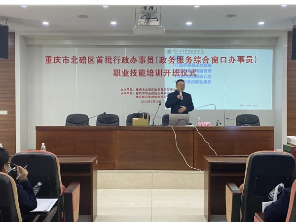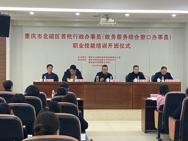 2月19日,由重庆市北碚区政务服务中心主办,我校和重庆市职业技能公共实训中心共同承办的北碚区首批行政办事员职业技能培训班在北培区政务服务中心举行。北碚区区委常委、常务副区长章榕,北培区副区长陈政,市人力社保局政策法规处处长胡京,北碚区政务服务办主任辛国民,重庆市职业技能公共实训中心主任张洪刚,我校继续教育学院院长陈娜,北培区各街镇代表及59名窗口工作人员参加了本次培训开班仪式。