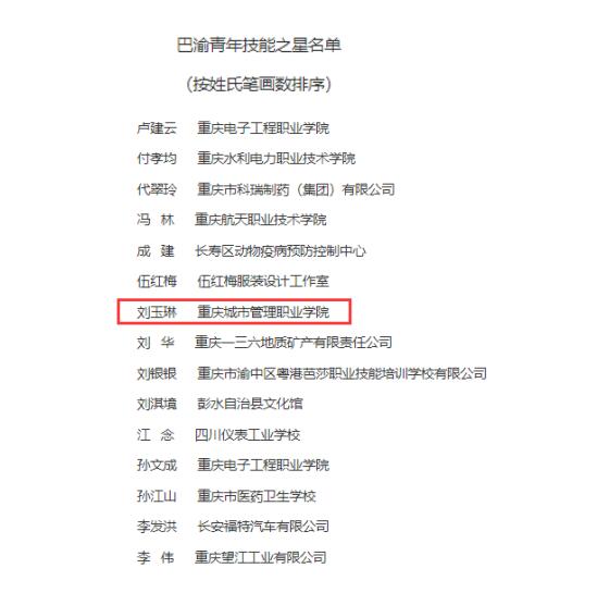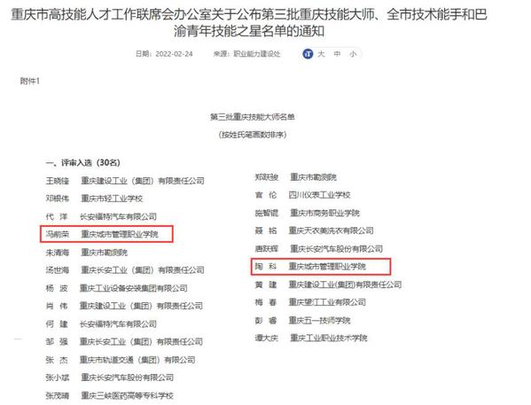 2月23日,重庆市高技能人才工作联席会办公室公布了第三批重庆技能大师、全市技术能手和巴渝青年技能之星名单。我校文化与旅游管理学院冯前荣、智慧康养学院陶科荣获“重庆技能大师”称号,智慧康养学院刘玉琳荣获“巴渝青年之星”称号。