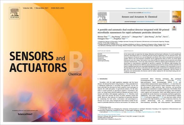 近年来,我校围绕国家创新驱动发展战略,强化党建工作引领,以创新培养和质量提升为动力,以“双高”建设为契机,守正创新,提高质量,鼓励科研工作者发表高水平高质量论文。日前,智慧康养学院(重庆市智慧康复养老工程技术研究中心/博士科研创新中心)赵师贤老师及其团队在小型自动化检测设备及方法研究中取得突破,相关研究成果发表在工程技术领域国际知名学术期刊《Sensors and Actuators B: Chemical》(中科院仪器仪表类TOP一区,JCR一区,2021年影响因子7.46)。题目为《A portable and automatic dual-readout detector integrated with 3D-printed microfluidic nanosensors for rapid carbamate pesticides detection》。赵师贤为该论文第一作者,智慧康养学院雷靳灿副院长为该论文的第一通讯作者。