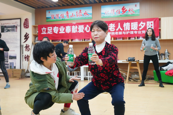 由智慧康养学院党总支社体专业党支部和老服与护理专业党支部师生党员精心编排了适合老年人的健美操。在社区活动中心,伴随着动感的音乐,志愿者带领老人们一起跳了起来,原地踏步、伸臂拍手、弯臂扩胸、头部运动......志愿者一边讲解一边示范,将每一步动作进行拆解,耐心指导,老人们很快掌握到动作要领,可以合着音乐的节拍舞动起来,一个转身、一个抬头,尽显夕阳风采,不少来社区办事的老人也纷纷参与进来。天门社区书记严勇说到:“伴随着我国步入深度老龄化社会,健康老龄化的观念深入人心,运动是老人保持健康的最佳途径,引导社区广大老人动起来是一件利国利民的好事。”