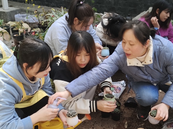 劳动教育课堂气氛活跃,师生们欢声笑语,积极参与。在园林技术专业庄华蓉老师的指导下,老师与同学们一起系上围裙,拿起工具,一边修剪枯枝、浇灌植物,一边交流绿植养护技巧与方法。师生们分工协作,松土换盆、翻装沃土、剪根修枝、造型设计、装盆栽植、填土压实,喷壶浇灌,一道道工序完美有序。在师生们的共同劳作下,经过精心的转移栽培,一盆盆多肉“玉露”,可爱萌萌,晶莹剔透。在“三八”妇女节到来之际,同学们将自己种植的多肉“玉露”,亲手送给学院的每一位女老师,以此向女同胞们致以节日的问候。