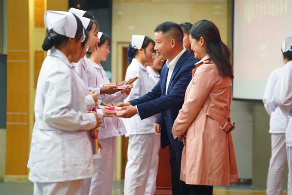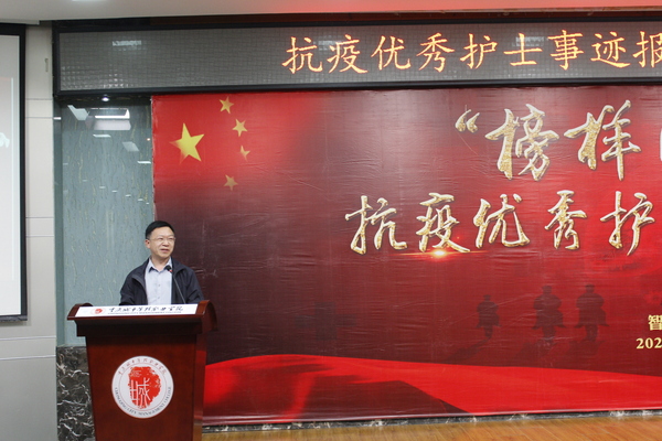 重庆市抗击新冠肺炎疫情先进个人、原重庆市垫江县人民医院消化内科护士长兼任内科片区护士长、现重庆城市管理职业学院护理专业专任教师李春梅副主任护师进行了《我在武汉的34天》的报告。回顾起自己在战场上火线入党,面对党旗许下庄重承诺的情景,她数度哽咽。她激励全体护理师生:护理人,若国有所需,我辈当作为!