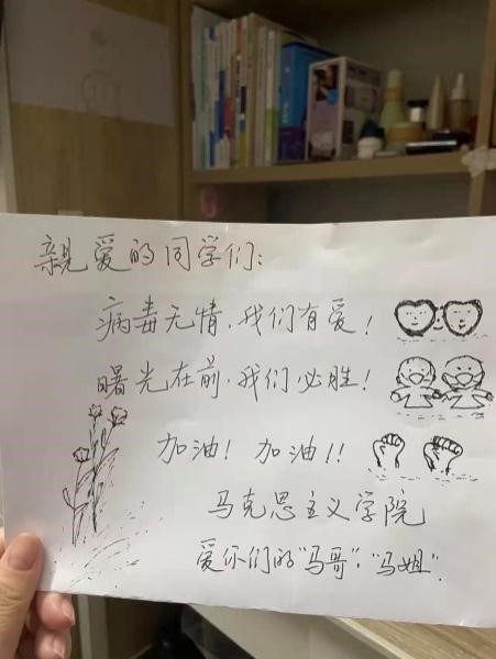 进入学生社区后,“马哥马姐”志愿服务队协助学生社区发放餐食、维持秩序、帮助同学传递生活物资等,秉持“不落下一寝一人”的原则,大家不辞艰辛,扛物资、爬楼梯、确保同学们准时吃饱饭。“马哥马姐”坚信,多为同学们着想,同学们就多一份保障!为了让同学们在疫情期间坚定战胜疫情的信念,“马哥马姐”们为宁静园一舍的所有宿舍手写祝愿,送上温暖寄语:“宅在宿舍的日子,你们好好吃饭,好好休息,读读书,原地跑跑步,疫情过后,马哥马姐陪你们看夕阳”“你们安好,是我们最大的心愿!同学们我们一起加油!”“记住,马哥马姐一直和你们在一起”“没有一个冬天不会逾越,没有一个春天不会到来”“希望如期而至的不止是春天,还有疫情后平平安安的你们”“病毒可以被隔离,但温暖不会被隔离”“无论遇到多大的困难,共担风雨,我们在一起”“你们能吃好饭就是我们最大的心愿”“每一份坚守,都将汇聚成无往不胜的不竭动力”……