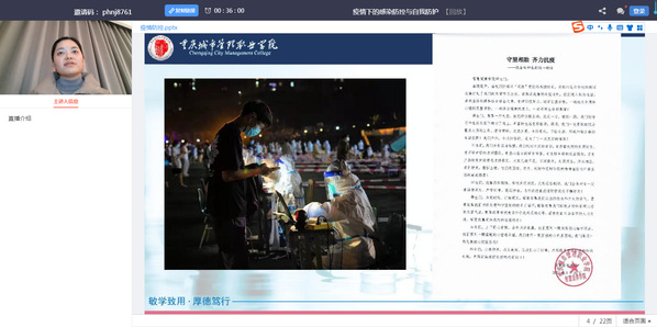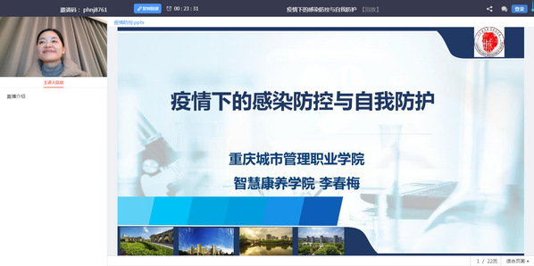 主讲人李春梅老师以“疫情下的感染防控与自我防护”为主题,将2020年武汉抗疫的成功案例作为切入点,分析了武汉抗疫的成功经验,并从防护的重要性、流行病特点和感染防控与自我防护的具体要求等方面进行讲解,与同学们分享了新冠肺炎病毒的防护技巧与方法。