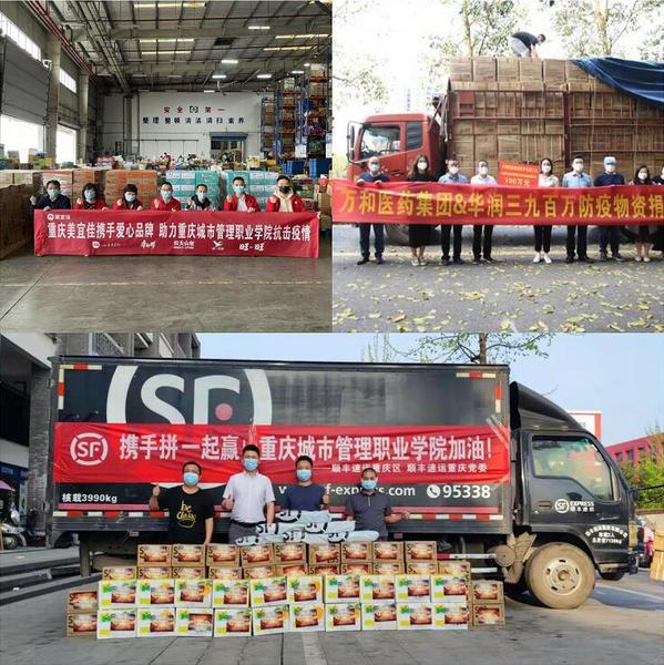 成渝地区双城经济圈商贸流通职教集团单位:重庆顺丰速运有限公司、美宜佳(重庆)便利店有限公司,合作企业:飞蚂智能科技(苏州)有限公司、重庆陆佰利商贸有限公司、重庆新世纪百货&阳光世纪、盒马鲜生等企业积极捐赠抗疫急需的防疫物资,助力我校抗击疫情;商学院连锁、营销等专业校友会心系母校,组织捐赠衣物、方便面、水果、食品等急需物资,与母校心连心、共克时艰。