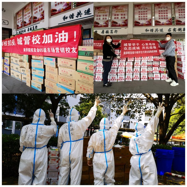 疫情初发,来自商学院的爱心合作企业重庆市万和药房连锁有限公司第一时间为我校筹集了超过百万元的防疫急需的医用外科口罩、消毒液、感冒灵颗粒、蛋白粉等物资和药品。商学院金莹等党员教师纷纷筹措捐赠物资,通过物质的支持,精神的鼓舞,为我校战胜疫情增添了力量和信心。