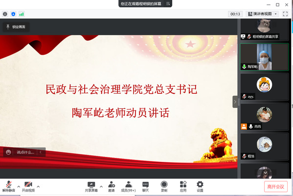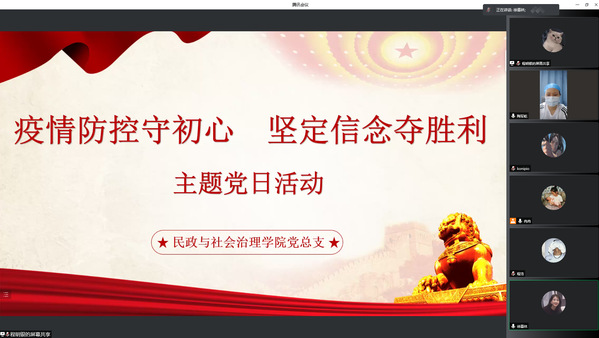 为在疫情防控时期更好地发挥基层党组织战斗堡垒作用和党员先锋模范作用,3月19日民政与社会治理学院党总支于线上开展了“疫情防控守初心,坚定信念夺胜利”主题党日活动,本次党日活动以线上讲党课的形式进行。民政与社会治理学院党总支书记陶军屹、党总支副书记李国英、马克思主义学院高再秋老师、民政专业党支部组织纪检委员丁佳以及民政与社会治理学院学生党员、2020级入党积极分子和党员教育求真服务中心全体成员参加此次活动。