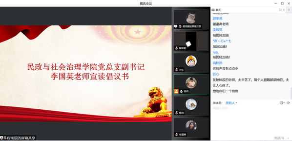 高再秋老师讲述了钟南山等抗疫一线优秀党员的先进事迹;赞扬了在生活中尽一己之力为疫情防控做出贡献的平凡天使、社区志愿者和公安民警;并对同学们提出“五个要”,即要在隔离期间保证身体心理健康,要遵守底线意识,要努力克服困难,要传递满满的正能量,要保持积极乐观的心态;同时希望同学们,树立和城管校命运共同体意识,牢记我们都是城管人,我们要团结一心,发挥学生党员的先锋模范作用,与学校的老师和同学共同努力,打赢这场没有硝烟的战争。