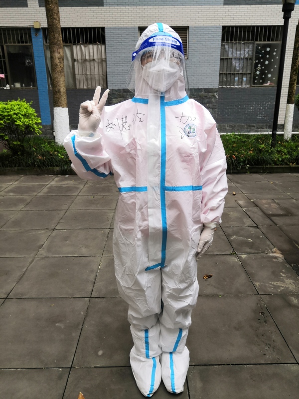 3月14日上午,刘慧玲老师简单收拾生活用品后,来到秋实园二舍,开始了在宿舍参与志愿服务的“战斗”生活。B栋是有确诊人员的宿舍楼栋,有众多密接人群,是学校疫情防控最危险的宿舍楼之一。志愿者们只要一出自己所在的房间,就必须穿上厚厚的防护服,做好严格的防护措施,才能开展送餐、巡逻等服务工作。