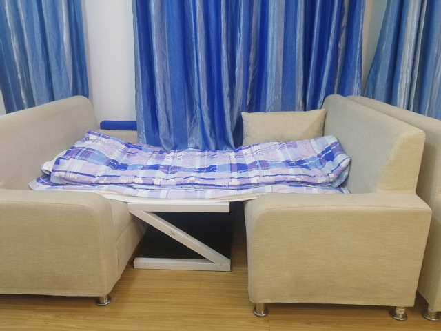 不过,由于他们经常出差,应变能力、生存能力较强,很快就冷静了下来。在积极配合学校隔离、核检的同时,他们没有向学校提出任何要求,自己在楼内寻找到实训室长久未用的沙发、竹杆、布条、电线等物资,搭起了简易床、晾衣杆,还在洗手间隔出了沐浴房,过起了10年前打工仔的生活。