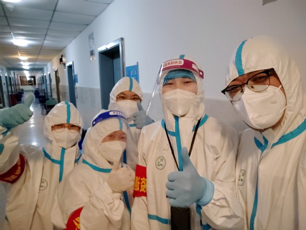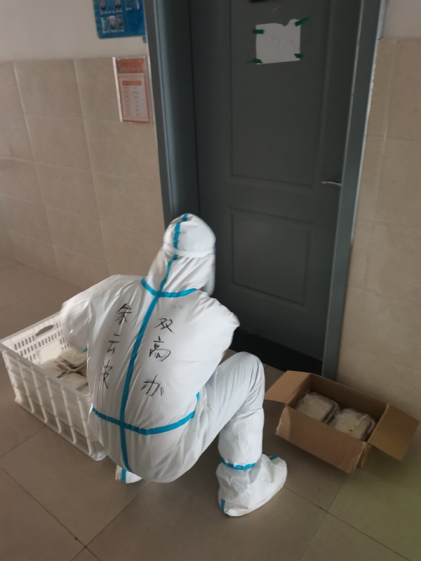 封控之初,朱老师和同事们遇到了物资短缺、人员紧缺、垃圾处理不及时、学生串寝、焦虑、吃不饱等问题。到岗后,朱老师首先与同学们谈心交流,摸清在寝学生人数、了解学生需求、稳住学生情绪,给予关爱和鼓励。由于人员紧缺,刚到宿舍的前三天,朱老师每天都要工作18个小时以上。为了节约时间,朱老师的防护服一穿就是一天,尽量不喝水、不上厕所,汗水把衣服打湿又穿干,一遍又一遍,口罩勒得脸变了形,手长时间被汗水浸泡得变成了白色。晚上脱下防护服时,和女儿视频时,女儿心疼地说:“爸爸,你的脸和手怎么啦?”他回答说:“爸爸的学校生病了,我们在帮它治病。”