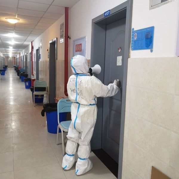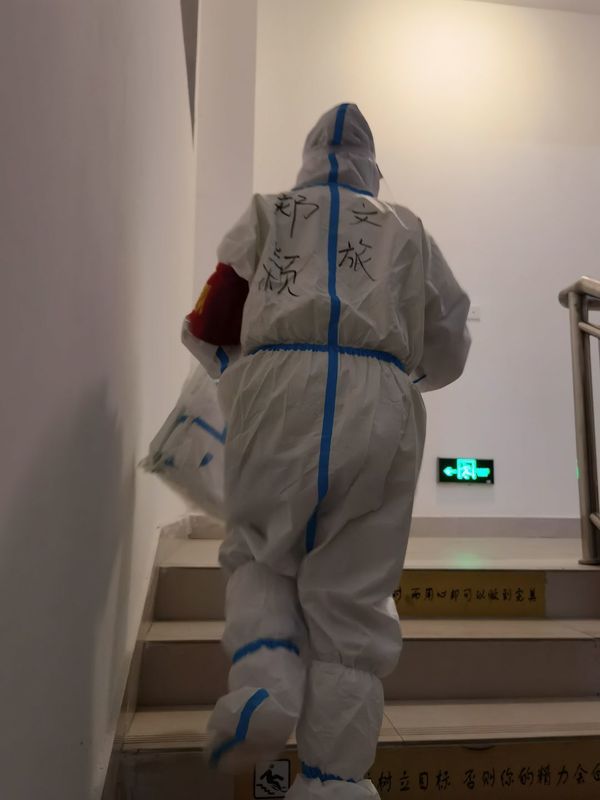 因疫情爆发突然,郑颖入住学生寝室后,前几日的工作任务特别繁重。当时最辛苦的就是解决几百名学生一日三餐的配送,在没有其他支援力量的情况下,郑颖和入驻女老师们,巾帼不让须眉,挺身而上,靠着毅力将一袋袋沉重的饭菜,从一楼提到六楼,逐个分发到每个寝室,从不叫苦喊累。30度的天气里,全身上下在密不透风的防护服包裹下,郑颖和老师们每天都在蒸桑拿,衣裤湿透好几遍。