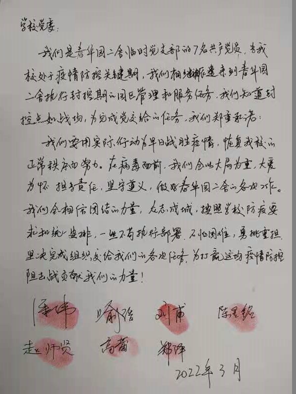春华园二舍临时党支部成立以来,积极发挥支部战斗堡垒作用,充分发挥基层党组织的政治优势、组织优势,召开专题组织生活会,全面查找疫情防控中存在的问题,深入剖析问题原因,制定整改措施,不断提升临时党支部的凝聚力、组织力和战斗力。全体党员同志在疫情防控战线上始终带头站在最前列、冲在第一线,时刻将保护学生生命健康安全放在心头,将遏制疫情蔓延扩散的责任担在肩上,把关怀照顾学生的思想和生活落到细微实处,身体力行扛起抗疫重任。