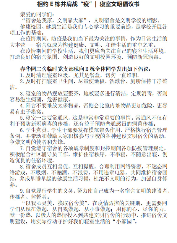 第三,加强文明劝导,筑牢防护屏障。针对封控期间学生寝室生活习惯不好,清洁卫生状况较差等问题,临时党支部向所有学生发起了文明寝室生活倡议。支部党员分组走访了全部寝室,向学生宣传新冠肺炎预防常识,引导全体学生在封控期间自觉遵守学校疫情防控要求,不串寝、不出寝;做好寝室清洁卫生,保持干净整洁的居住环境;养成早睡早起的生活习惯,适当锻炼增强体质,从现在做起,从自我做起,从小事做起,筑牢防护屏障,用实际行动守护好寝室共同生活的“小家园”。