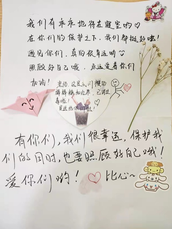 “同学,你们不要自己出门,有什么事给我们讲,我们帮你们。”李老师在查寝时,反复叮嘱到。“同学,你需要的牙膏送到了,给你放在椅子上了。” ……李老师每天认真地穿梭在一楼到六楼间,了解同学们的各种问题并及时处理。“好的,谢谢老师!”,“老师辛苦了”,宿舍里同学们积极的回应使李老师倍感温暖。
