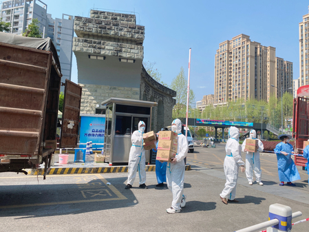 申书炜老师每当接到这样的电话,都迅速穿上防护服、戴上面罩,第一时间跑到大门口,确实不能通行,申老师就和司机师傅清点好车上捐赠物资,让司机师傅等在封控区外。自己将车子开进封控校园,再组织老师们下货。平时斯斯文文的老师,战疫时期也可以是风风火火的运输司机。