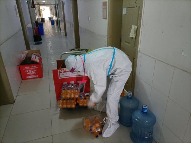疫情初期,进驻春华园二舍后,他每天早早的洗漱完毕,穿上密不透风的防护服,穿行于宿舍的各单元各楼层,一层又一层,一间又一间的给同学们送餐、送水、送日常生活用品以及组织同学们有序进行定期的核酸检测,确保全楼师生一个不漏。由于疫情初期人手不足,设备不齐,一栋楼329个房间,近1300名学生的一日三餐,都需要入住的几名志愿者老师用手提上去进行分发。30多度的高温下,他多次往返于1-6楼,几个小时下来,从头到脚都湿透了,有时甚至出现了缺氧眩晕的状况,就在楼梯间停留片刻,但是他一想到自己是一名共产党员,更有封闭在寝的学生,身体里就瞬间迸发出一股难以言喻的力量,支撑着他继续工作。