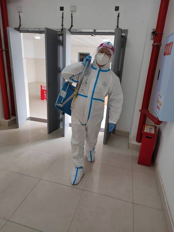 初入学生公寓时,他接收的第一项任务就是穿戴防护衣物,熟悉工作环境。在闷热的天气以及严密的防护下,汗水随即流淌全身,但是无暇顾及汗水,因为致远三舍学生们的一日三餐在等待着他。他双手提起饭菜从一楼爬到六楼,无数次往返,直到将饭菜分发到每间寝室。一声声的敲门声,一句句的“同学记得取餐、记得按时吃饭“的话语传遍整个楼道。虽然隔着门但却不隔心,一句句”老师我知道了!“、“好的,谢谢老师,辛苦了”的话语传入他心,让他深感这就是他的责任与使命。